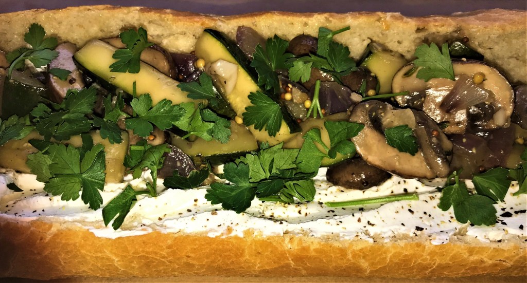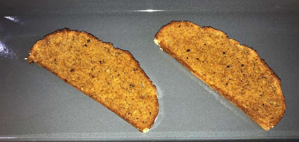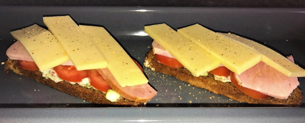 Now, in the same bowl as the truffle butter was in, mix a tablespoon of mayo with a tablespoon of mustard and the chopped spring onion. Then, making sure that the bread is on a baking tray (butter side up), slather on the mayo mix. Then on top place the sliced tomatoes, next the ham and finally slices of the Cheddar. Sprinkle the top with some pepper and (if you have it – garlic salt). Place in the oven until the cheese is deliciously bubbling, browning and smells like walking into a French pastry shop first thing in the morning.